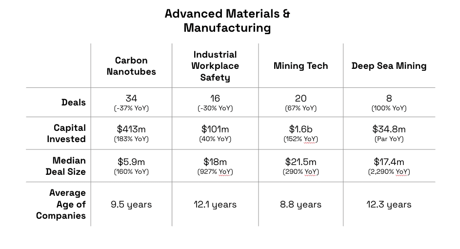 Despite the cold shoulder this sector is experiencing from investors, there are several niche spaces within the sector to watch in the second half of 2025 include carbon nanotubes, industrial workplace safety, mining tech, and deep-sea mining. These spaces have reported H1 metrics higher than last year in deal volume, total capital invested, and average age of companies. Proving market validation and hopefully strengthening the later stages and leading to continued m&a activity.