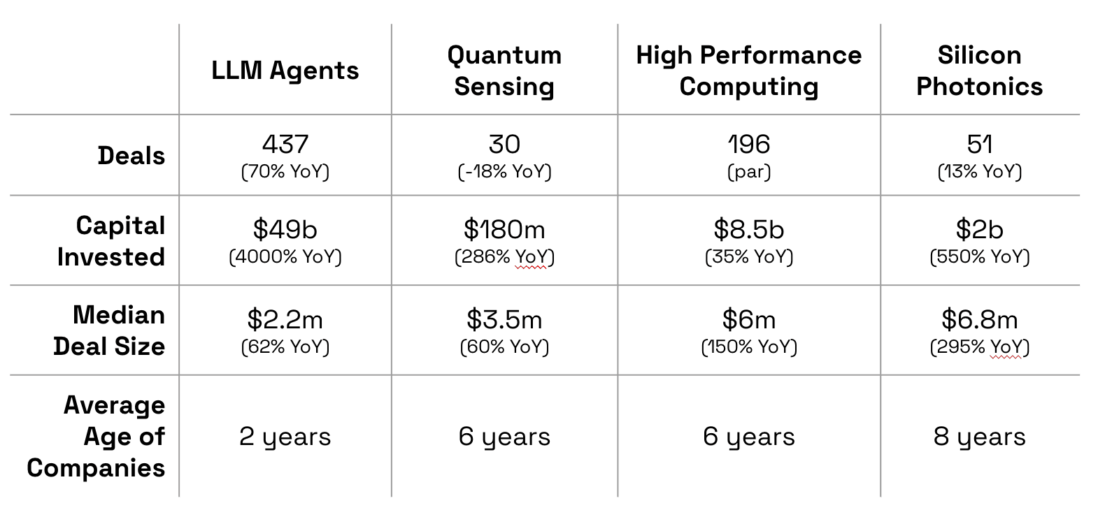 Some key spaces to watch in the second half of 2025 include LLM agents, quantum sensing, high-performance/quantum computing, and photonics. These spaces have reported H1 metrics higher than last year in deal volume, total capital invested, and average age of companies, proving market validation and strengthening the later-stage pipelines.